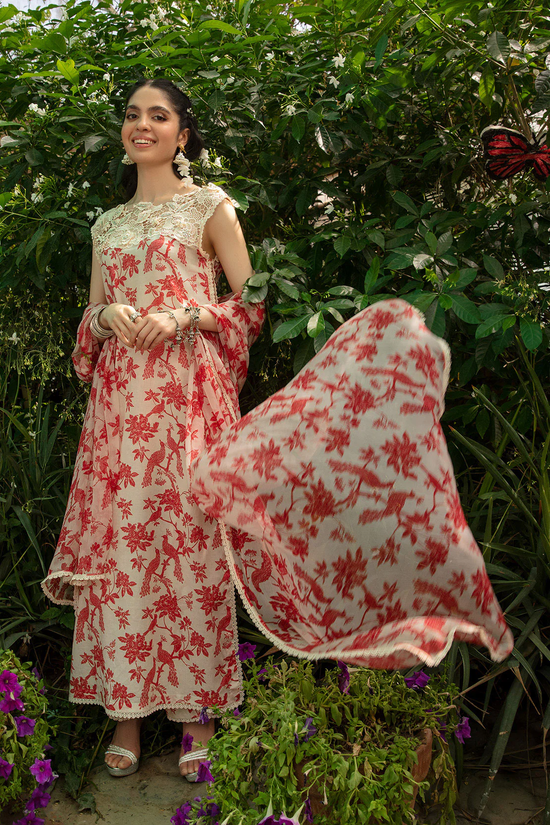 This toile printed shirt is rendered with coral hued imagery on a beige lawn canvas, which is lifted with a beige floral silk crochet fabric detail that is further enhanced through hand embellished crochet 3D florals' with pearls and crystals . The side slits are enhanced with lace detailings. This set is completed with same printed lawn izaar and same toile printed chiffon dupatta with lace finishing.