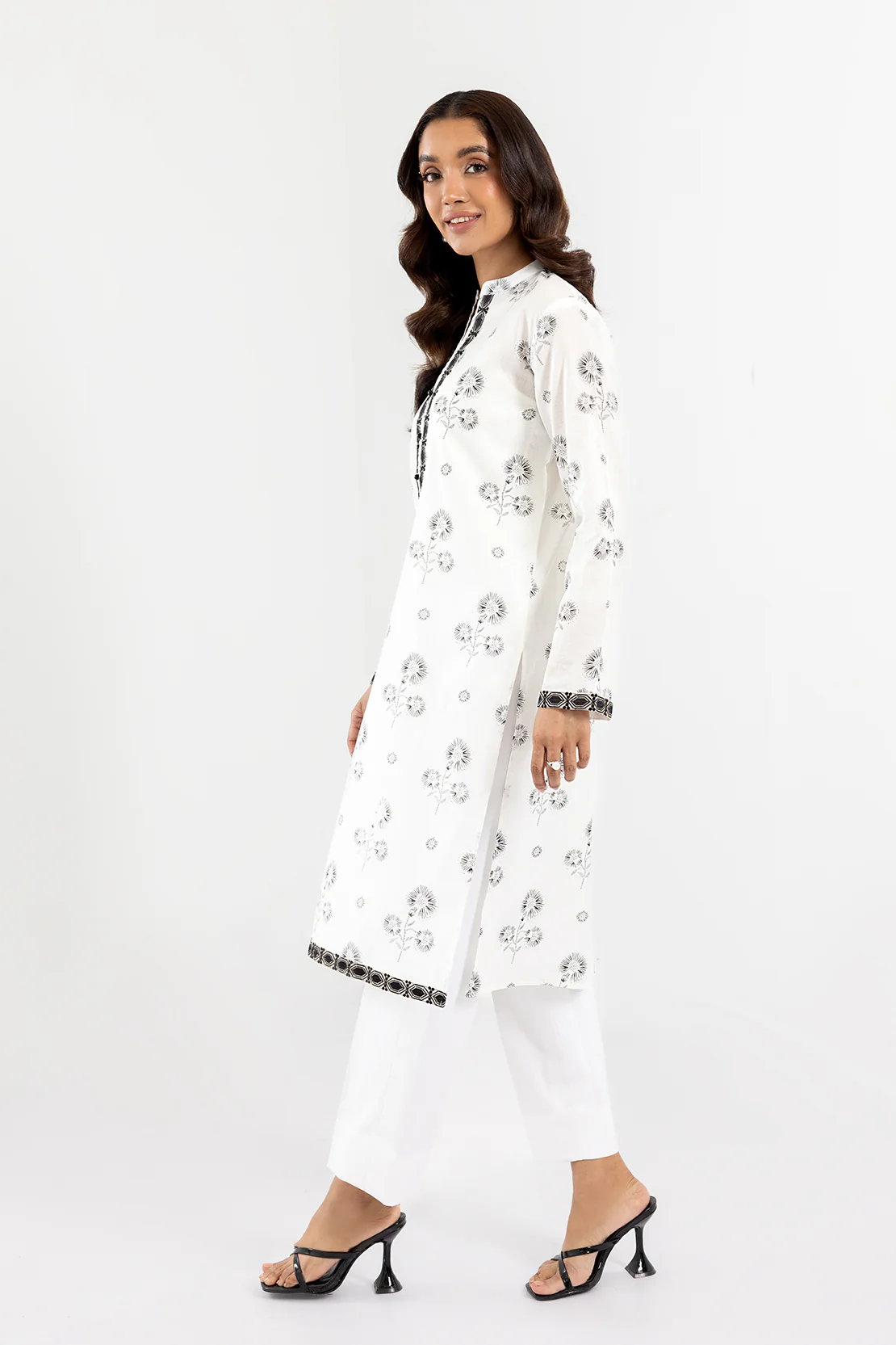 Immerse yourself in a monochrome printed two-piece ensemble featuring embroidered borders.