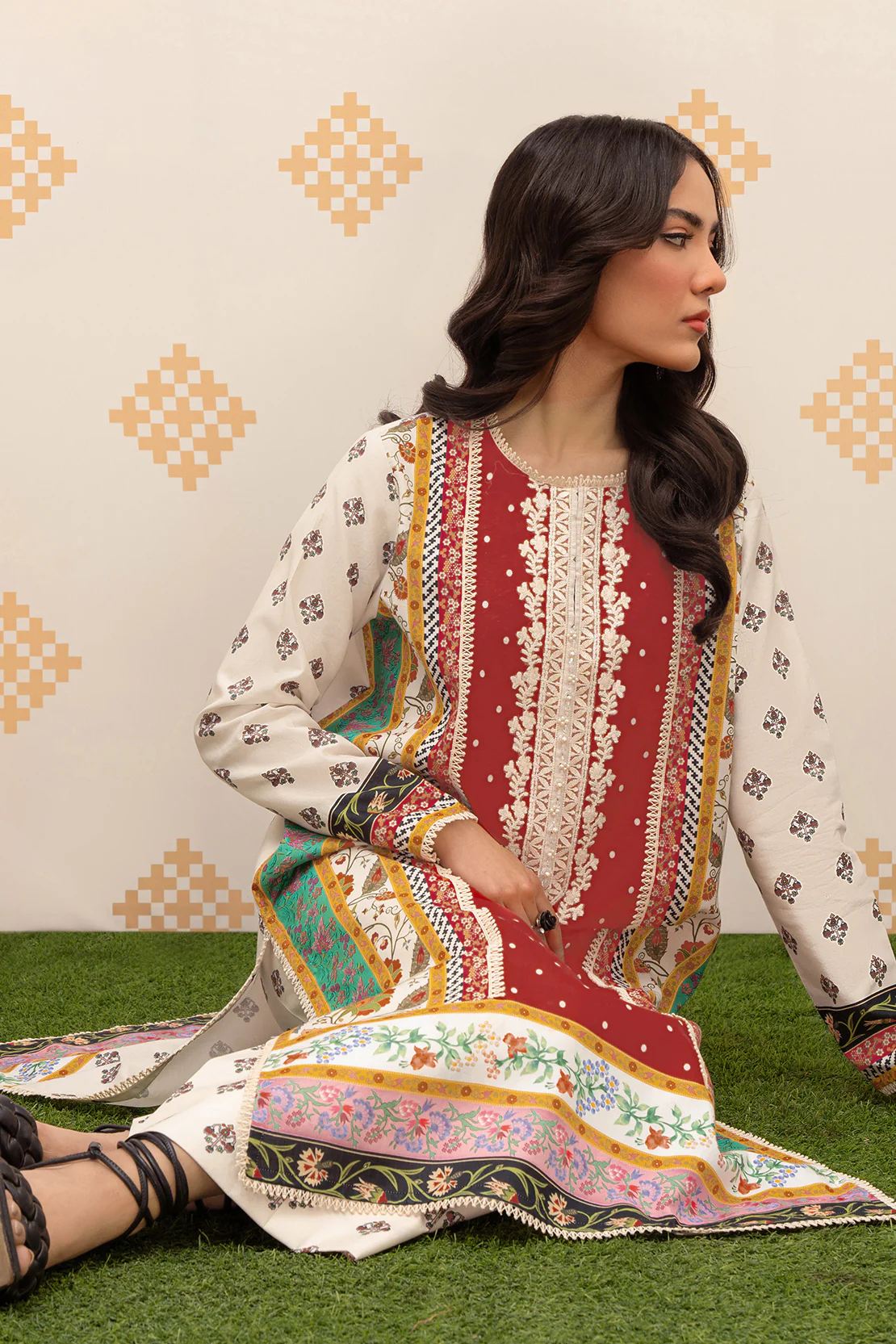 Make a bold statement with this vibrant multi-colored printed outfit with a white lawn base.