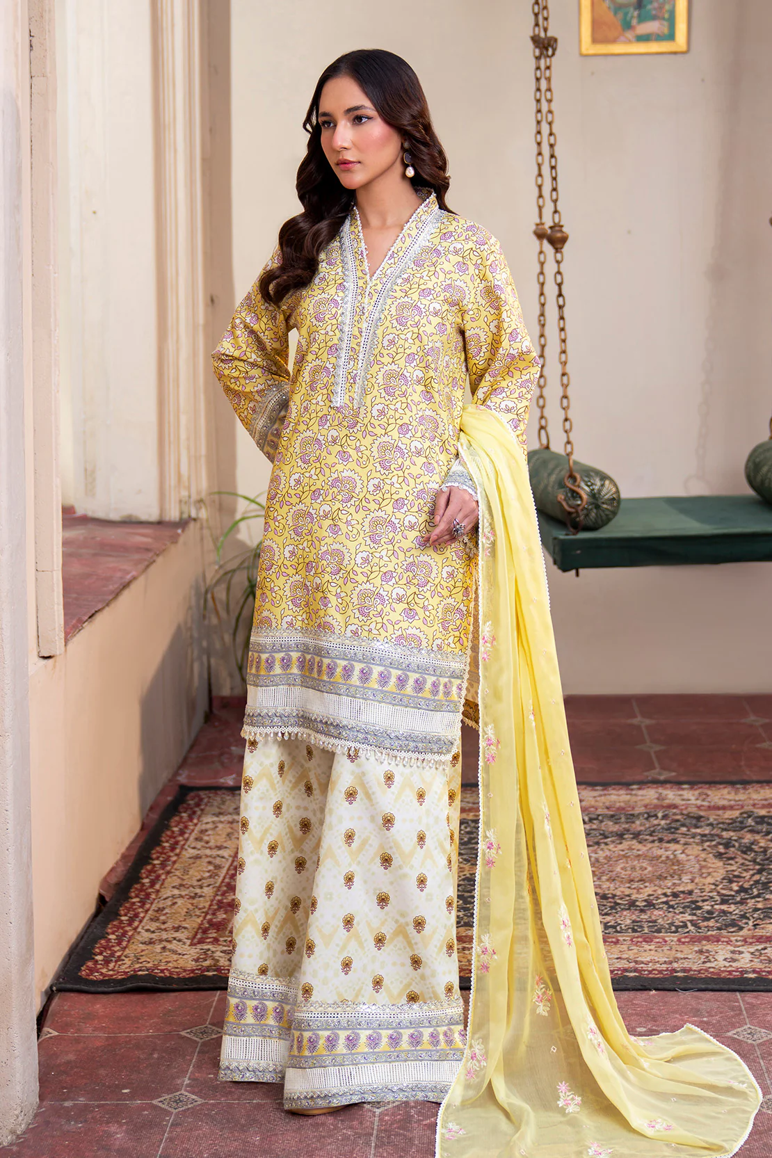 Step into sophistication with our digital printed lawn suit , complemented by a embroidered chiffon dupatta for a striking effect.