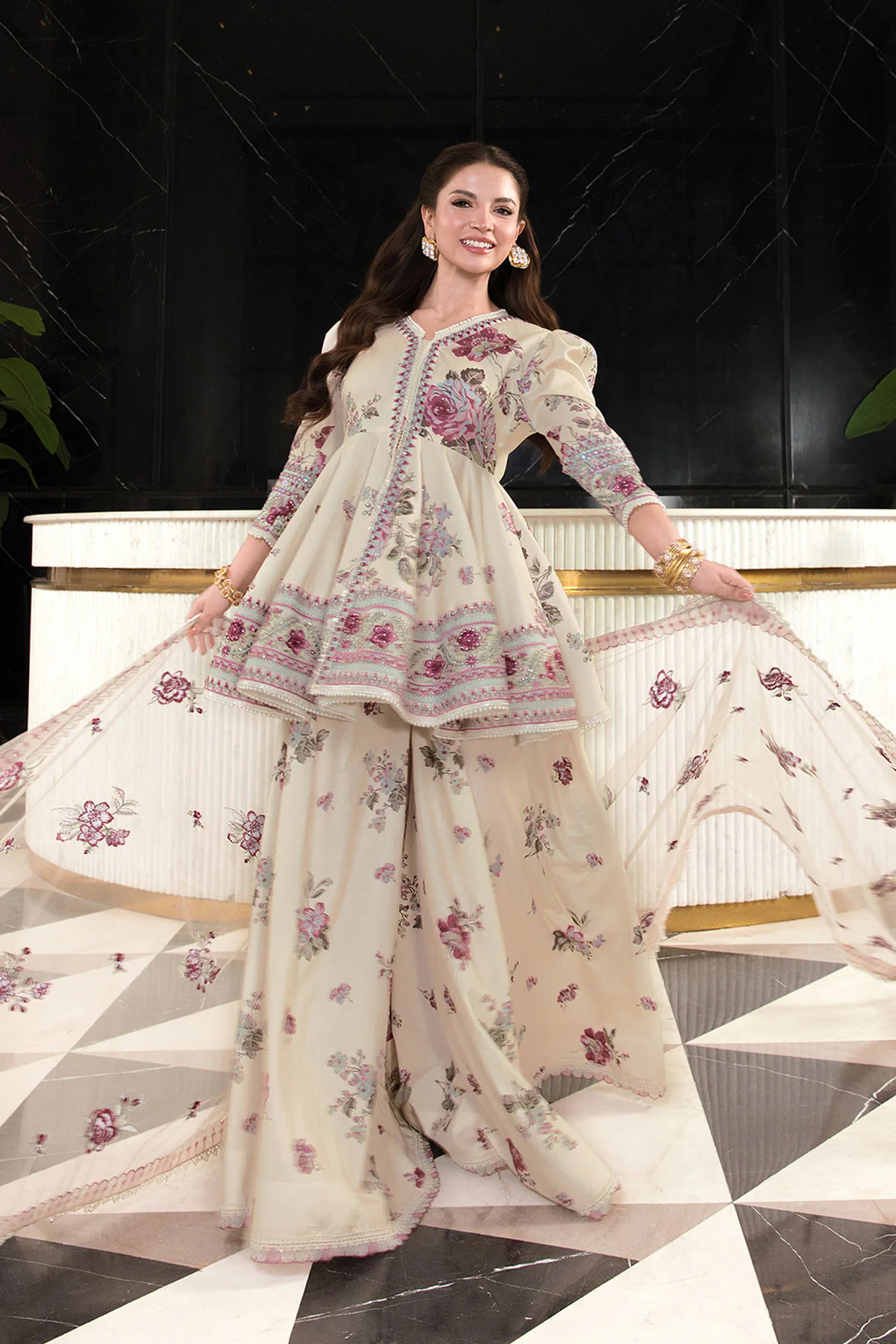 Rejoice festive elegance with this 3-Piece Premium Lawn Ensemble, featuring a floral vine print adorned with defined embroidered borders. The net dupatta is perfectly complemented by a graceful threadwork detail with floral spray that adds volume and flow. Paired with a coordinated printed trouser, the look feels airy, feminine, and effortlessly chic. Designed for Spring/Summer celebrations, this ensemble blends soft sophistication with a modern festive mood—ideal for Eid gatherings and daytime events.