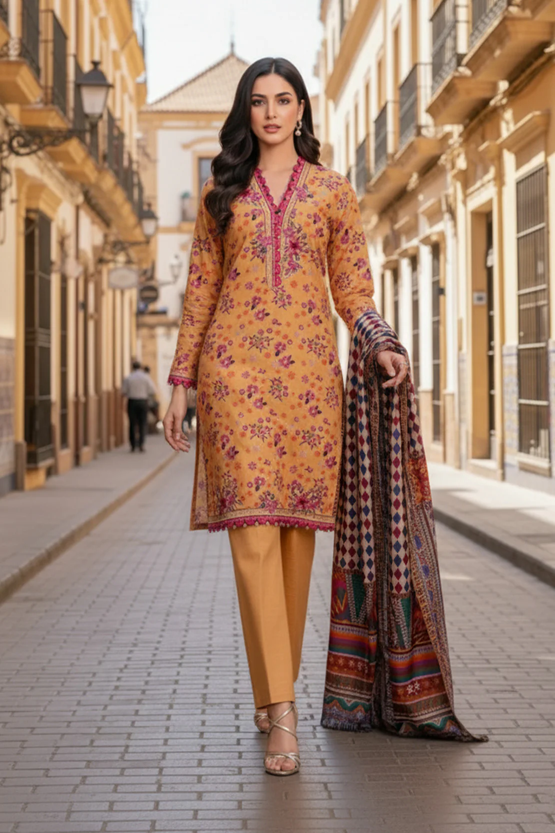 Curate the perfect winter outfit with our three-piece embroidered printed khaddar suit.