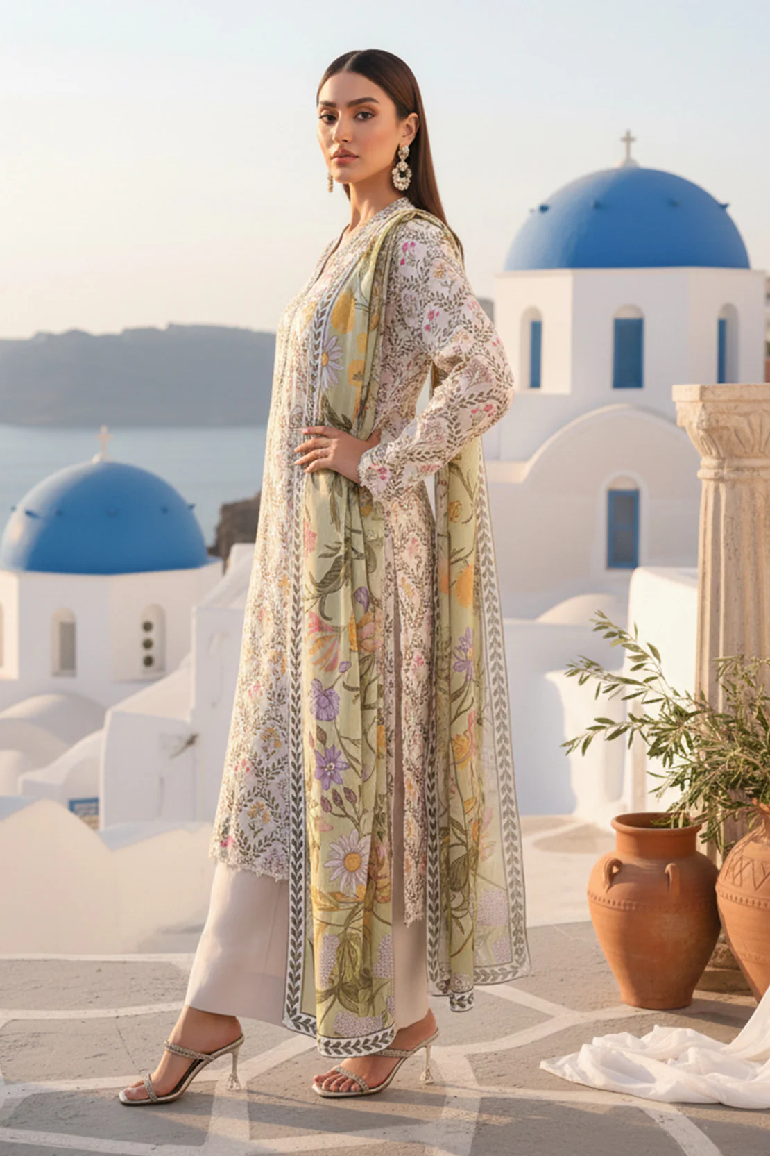 Embrace winter chic style in our printed three-piece khaddar suit, supported by printed dupatta and solid trousers.