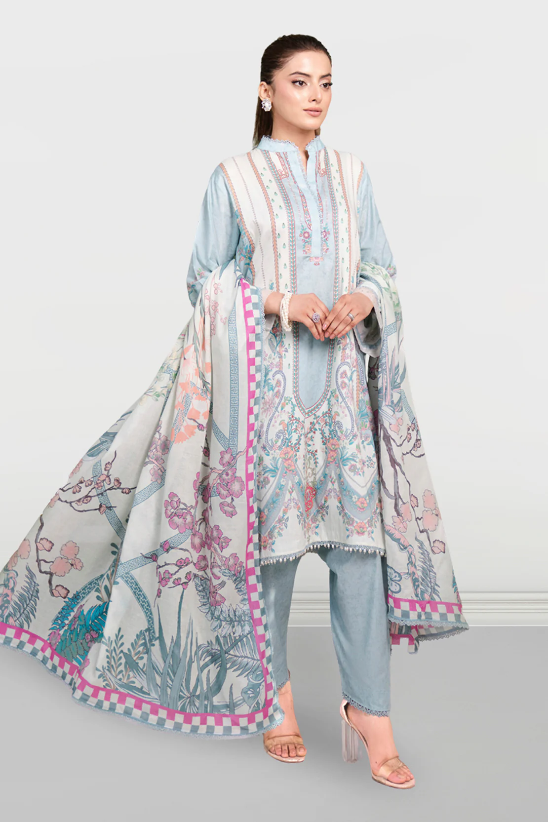 Elevate your style with our soothing printed ensemble, featuring a 3 - Piece Suit - Cambric Printed shirt paired with a printed lawn dupatta and cambric trousers.