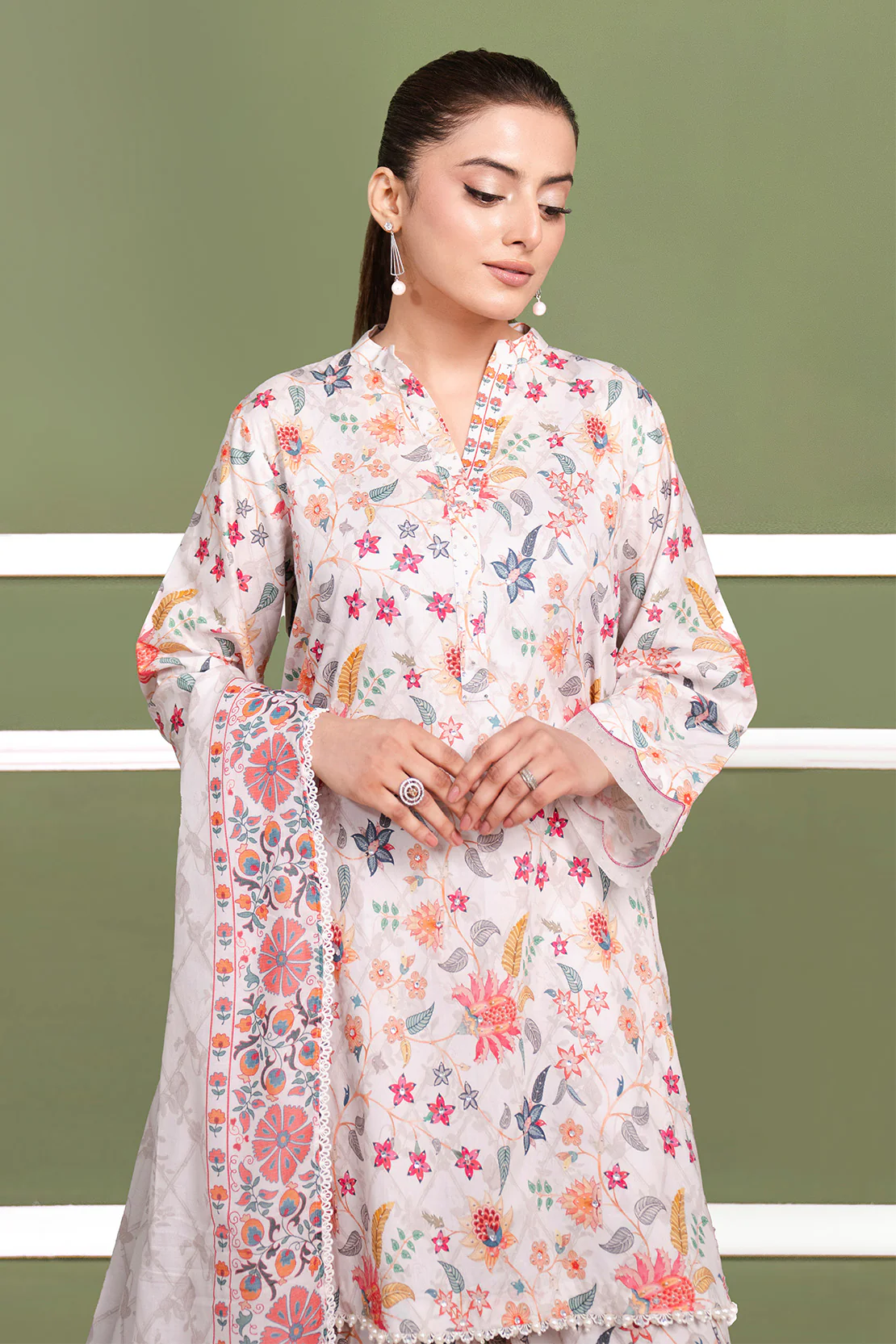 Revamp your style with our soothing printed ensemble, featuring a 3 - Piece Suit - Cambric Printed shirt paired with a printed lawn dupatta and cambric trousers.