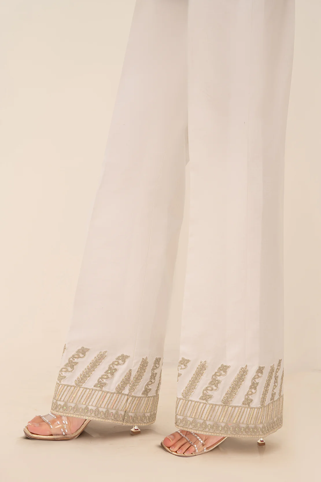 Complete your eid look with our off white boot cut pants with embroidery.
